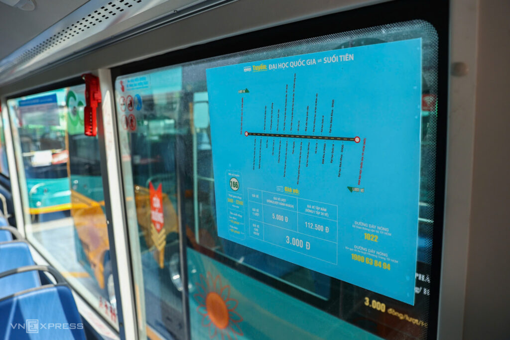 Mỗi xe đều dán lộ trình tuyến, giá vé từng chặng, đường dây nóng. Giá vé là 5.000 một lượt, học sinh sinh viên giá ưu đãi 3.000 đồng. Khách đi vé tập theo năm có giá 112.500 đồng.