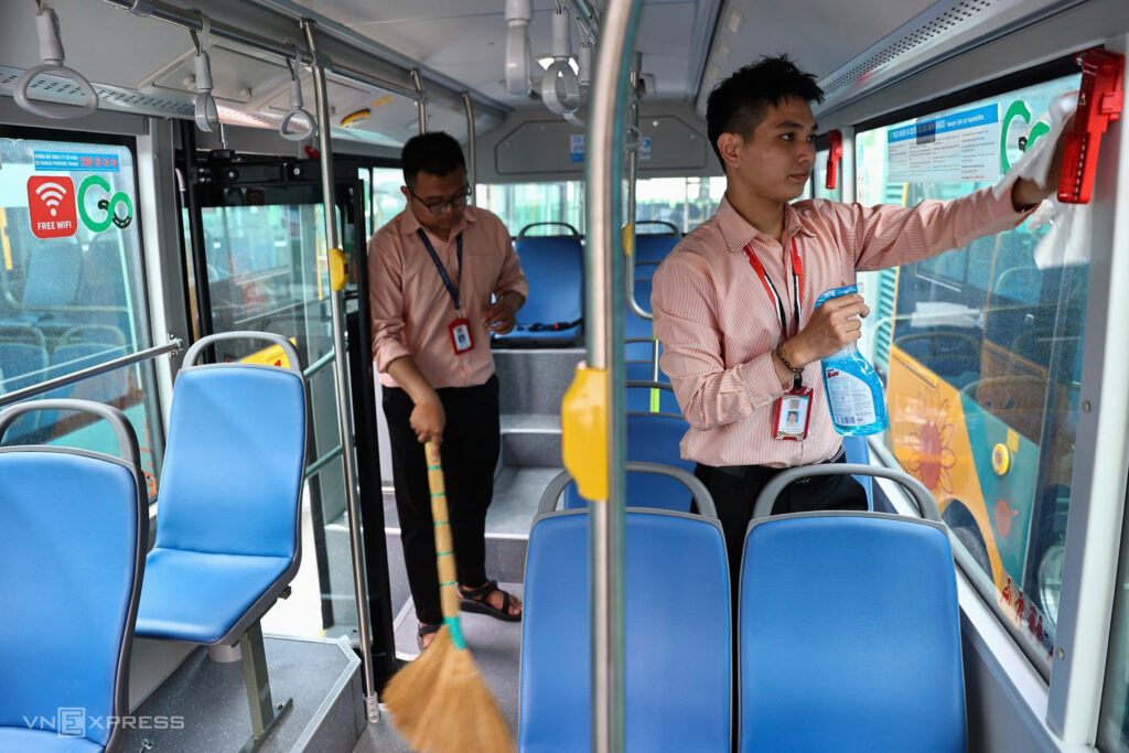 Trước ngày vận hành, nhân viên ở bãi xe tất bật dọn vệ sinh các tuyến xe buýt điện